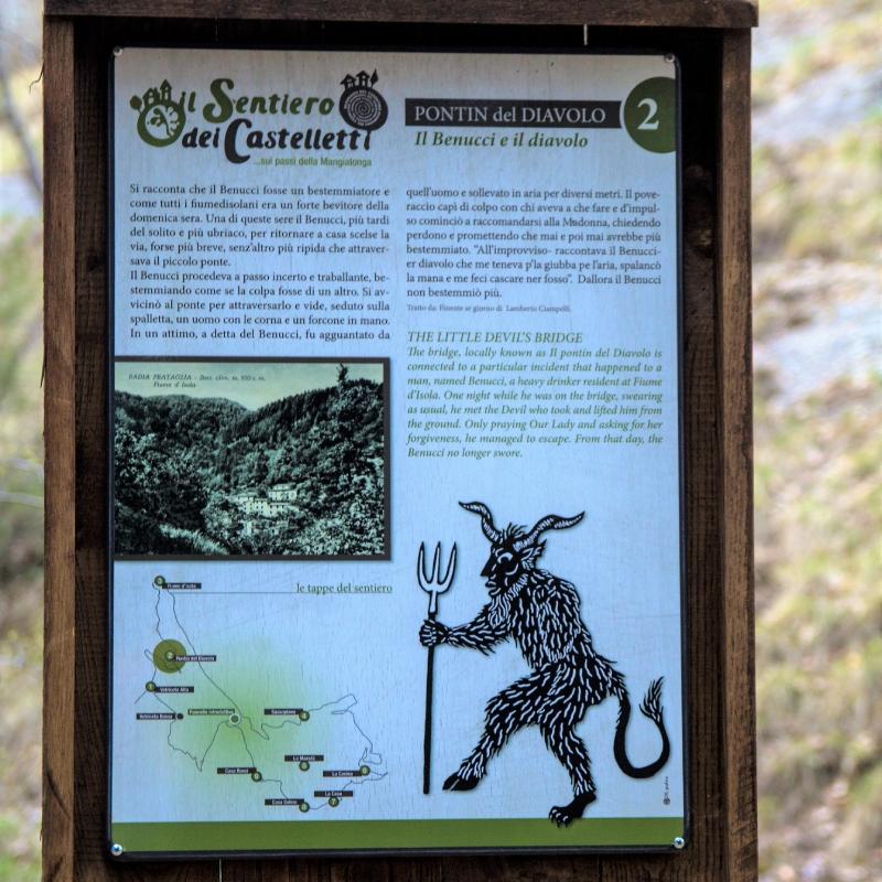 The following is one of the many stories that you will learn about along the way. The bridge, locally called "Il pontin del Diavolo" (The Devils bridge), located between the ‘castelletti’ of Vetriceta Alta and Fiume d'Isola, is connected to a particular story whose main character is Benucci, a heavy drinker who lived in Fiume d'Isola. One night while he was passing over the bridge, swearing, as he usually did, he met the devil who took hold of him and lifted him up off the ground. Only following Our Lady’s intervention, to whom he had begged forgiveness, did he manage to escape. Benucci stopped swearing from that day on (Source Lamberto Ciampelli). Come and hear the other stories!