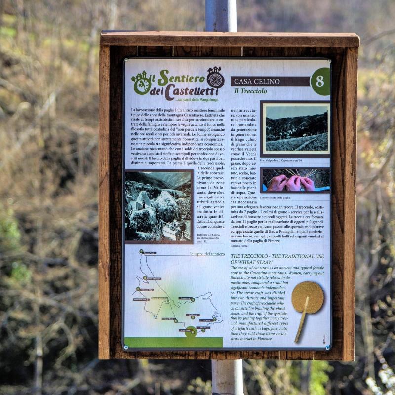 Un percorso attraverso il quale ritrovare fiducia, entusiasmo, spirito di comunità che rappresentano le premesse anche di un nuovo possibile rilancio socio-economico. Tra i temi centrali al centro dell’attenzione: le ritualità tradizionali ancora in essere, i prodotti e le sapienze manuali oggetto di censimento e approfondimento anche nell’ambito dell’”Atlante del patrimonio Immateriale del Casentino e della Valtiberina”. Una prima tappa del progetto di valorizzazione ha visto la realizzazione di un sentiero in grado di ricucire i diversi nuclei abitati (castelletti) offrendo così un'occasione concreta di incontro e confronto con gli abitanti, le loro tradizioni, le loro memorie ma anche con la vita e le aspirazioni del presente. L'itinerario accoglie alcuni pannelli descrittivi, a carattere tematico, da concepire anche come supporto alla visita. Caratteristiche del percorso:Trekking urbano > Naturalistico culturale; Lunghezza: 5 km; Livello difficoltà: Turistico; Tempo di percorrenza: 2 ore e 30 minuti.Di seguito le princioali località interessate ed il relativo tema oggetto di approfondimento: VETRICETA I “Fochi”; IL PONTIN DEL DIAVOLO Il Benucci e il diavolo; FIUME D’ISOLA Un maestro d’ascia; SASSOPIANO Leggende nella foresta, LA MAESTÀ Il turismo a Badia, LA CASINA I Maestri del legno, LA CASA I canti itineranti, CASA CELINO Il Trecciolo, CASA ROSSI La vecchia piazza.