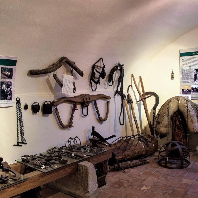 come si procedeva al taglio, al trasporto del legname e del carbone dal bosco fino a valle. Quindi anche mezzi e attrezzi specifici che la gente di montagna costruiva per rispondere alle proprie esigenze lavorative. Dalla sega per i tronchi a quella per le assi, varie tipologie di asce, di materiali per la raccolta dei frutti del sottobosco e tanti altri oggetti di interesse e curiosità. Un approfondimento viene dedicato anche alle piccole industrie forestali, ubicate in montagna, che in passato occupavano molte comunità nella manifattura di piccoli oggetti in legno.Un nuovo allestimento arricchisce le tre sezioni museali. Si trovano qui oggetti di uso quotidiano, rappresentativi della bottega del ciabattino nonché del falegname, ma anche di uso domestico come il “veggio” e tanti altri che appartengono ad un passato recente.